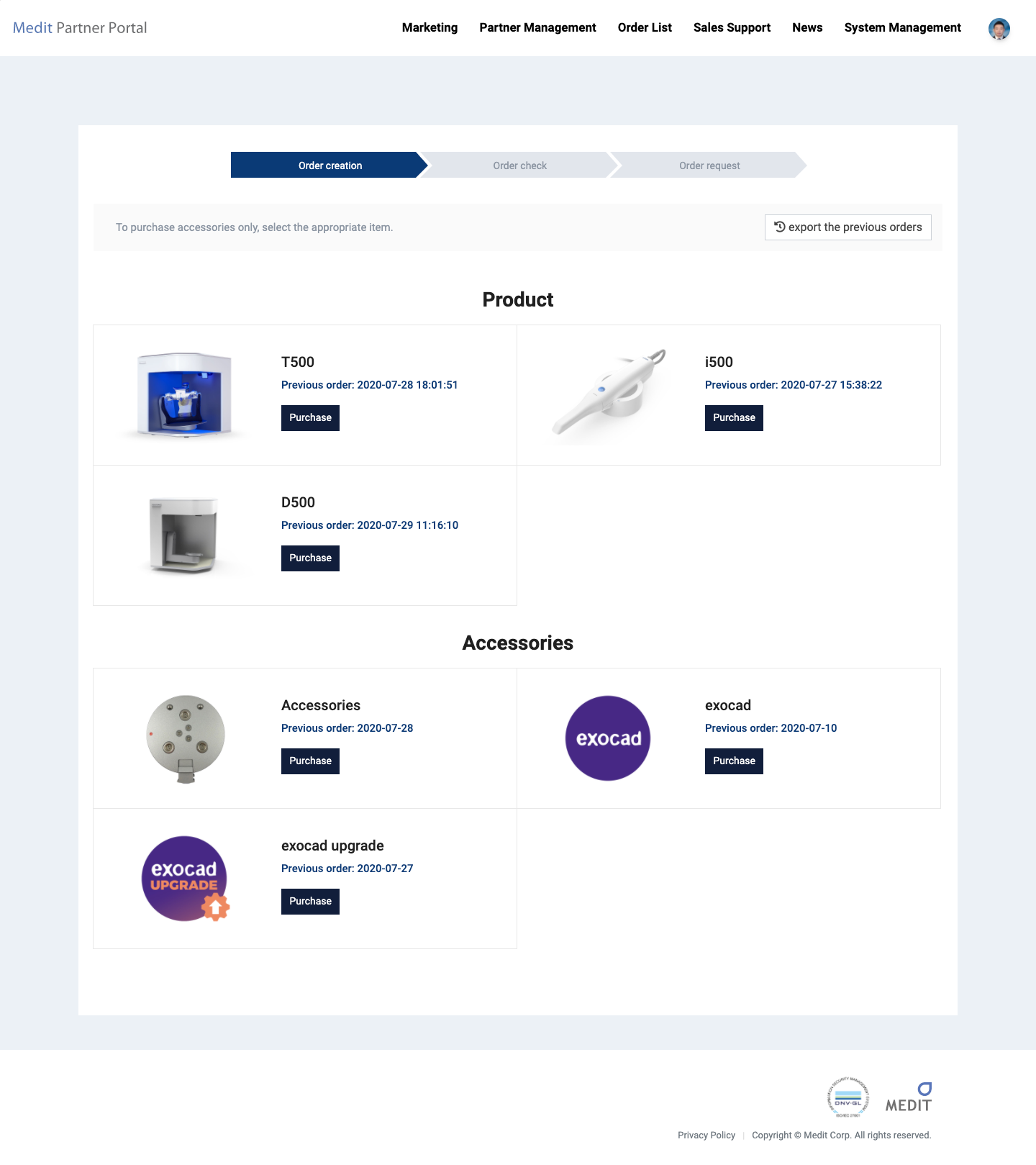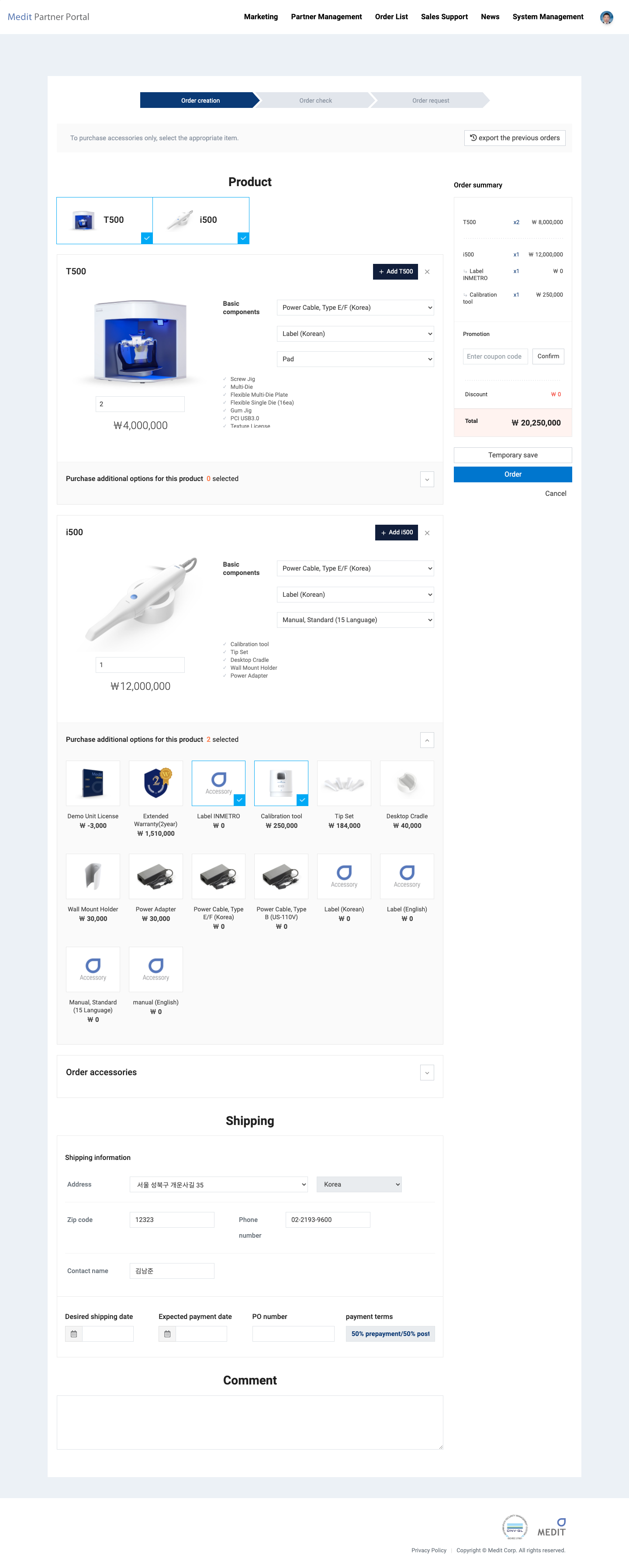 메디트의 글로벌 파트너(딜러)를 위한 B2B 포털 시스템입니다. 3D 스캐너 제품 주문, 배송 추적, Proforma Invoice 발행, 파트너 관리 등 딜러 영업 전 과정을 웹에서 처리할 수 있도록 구축했습니다.