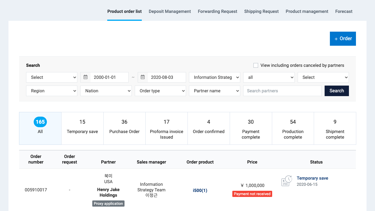 전체 주문을 날짜, 국가, 주문 유형, 파트너명 등 다양한 조건으로 검색하고 필터링할 수 있습니다. 주문 상태별 건수를 대시보드로 한눈에 파악할 수 있습니다.